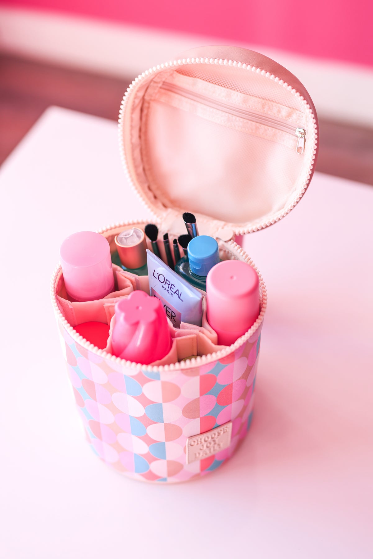 - Removable pocket dividers that can hold 7 cosmetic bottles